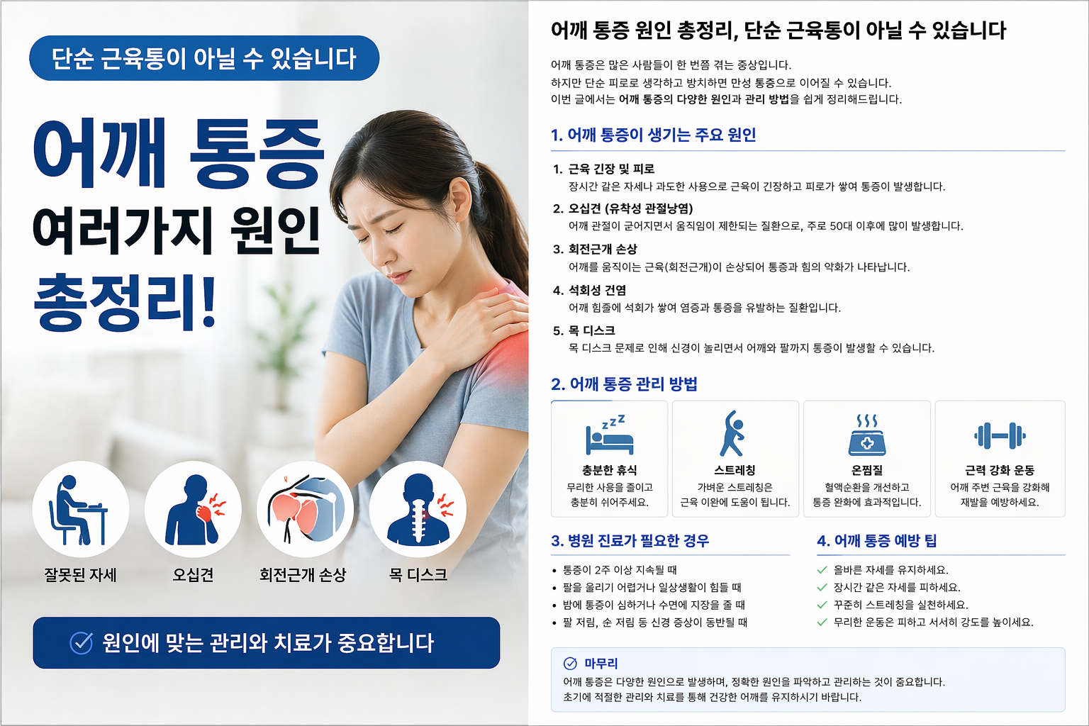 이번 글에서는 어깨 통증의 다양한 원인과 관리 방법을 정리해드립니다.